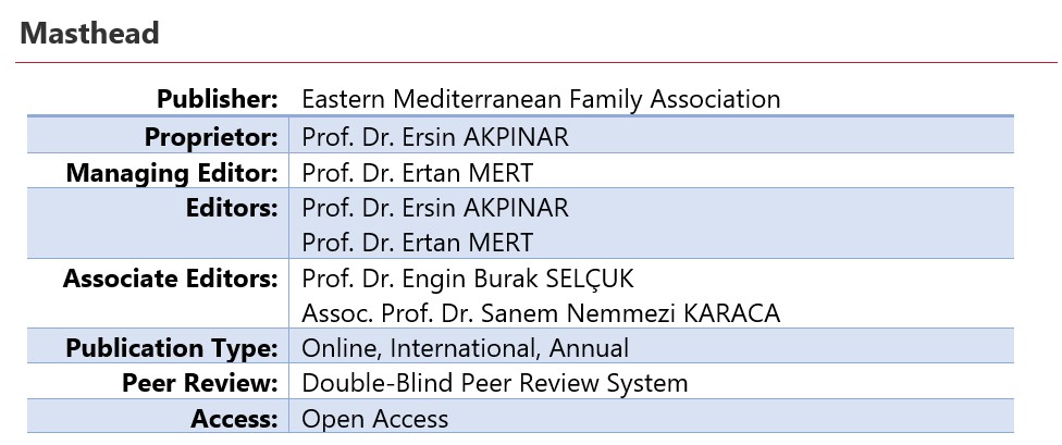All content published in the journal is licensed under the Doğu Akdeniz Aile Hekimliği Derneği (Eastern Mediterranean Family Medicine Association) International License which allows third parties to use the published version of content without making any modifications for non-commercial purposes as long as they give credit to the original work. This license permits use, distribution, and reproduction in any platform, provided that the article is properly cited, the usage is noncommercial, and no modifications or adaptations are made promoting the dissemination and use of the research published in the proceedings.